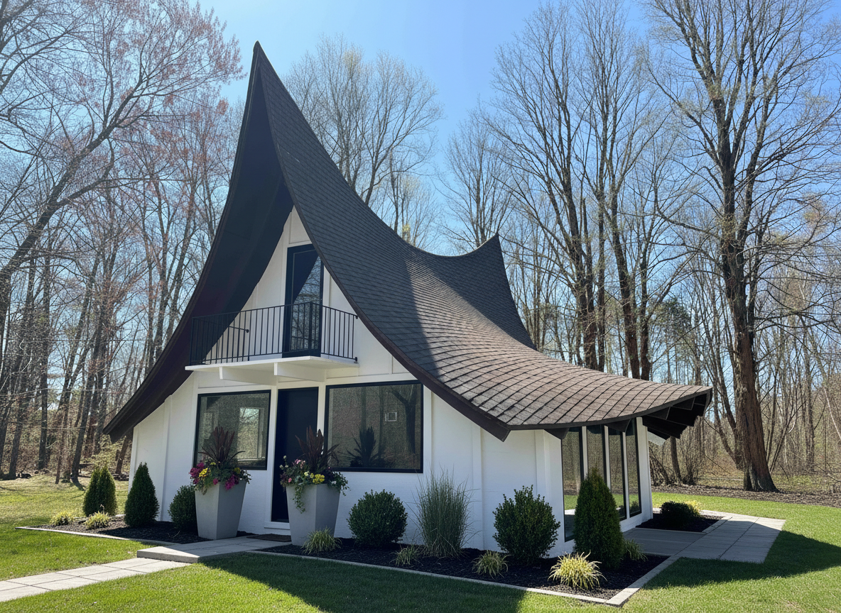 This Harry Potter looking house caught my eye immediately with that amazing roof structure. The interior is completely gutted with a spiral staircase. It has lake access nearby, perfect for a weekend getaway. There are so many possibilities with this home but to keep it fresh and open, I opted with a modern style.
